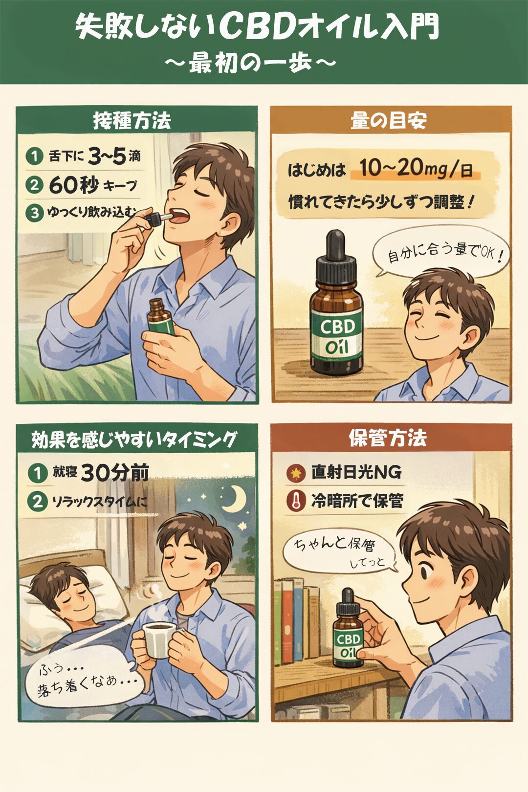 CBD自体に“酩酊作用”はありません。ただし眠気が出る人もいるため、最初は運転前の使用は避けるのが安心です。